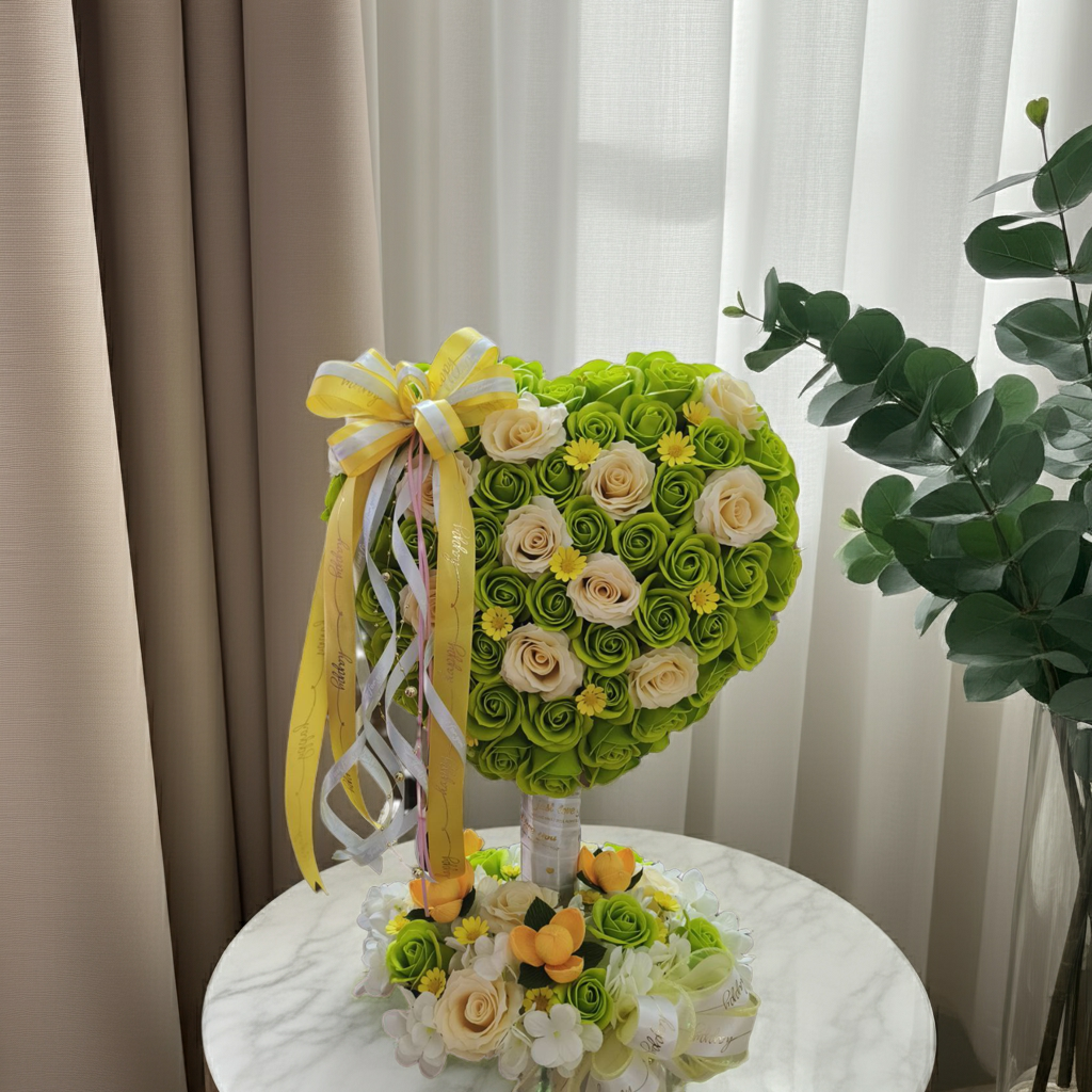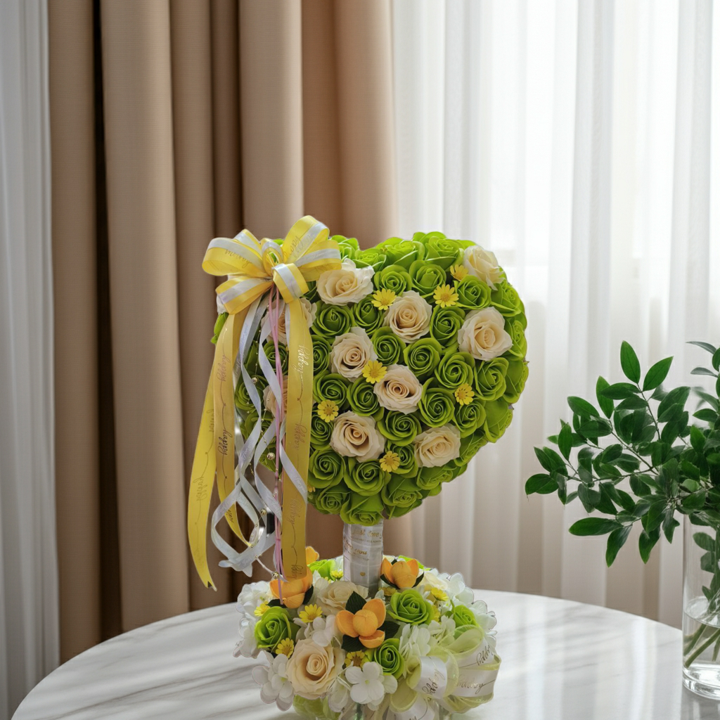 A luxury heart-shaped bouquet of green and cream roses, decorated with a yellow ribbon and elegant floral accents. Perfect for romantic celebrations and special gifts.