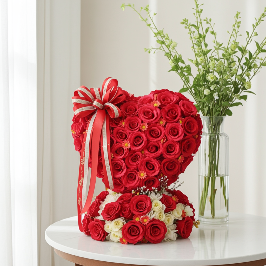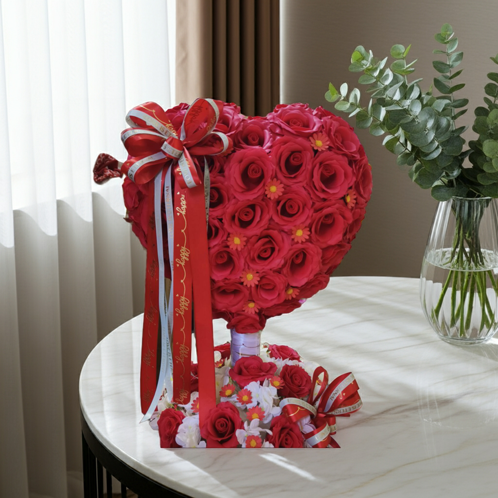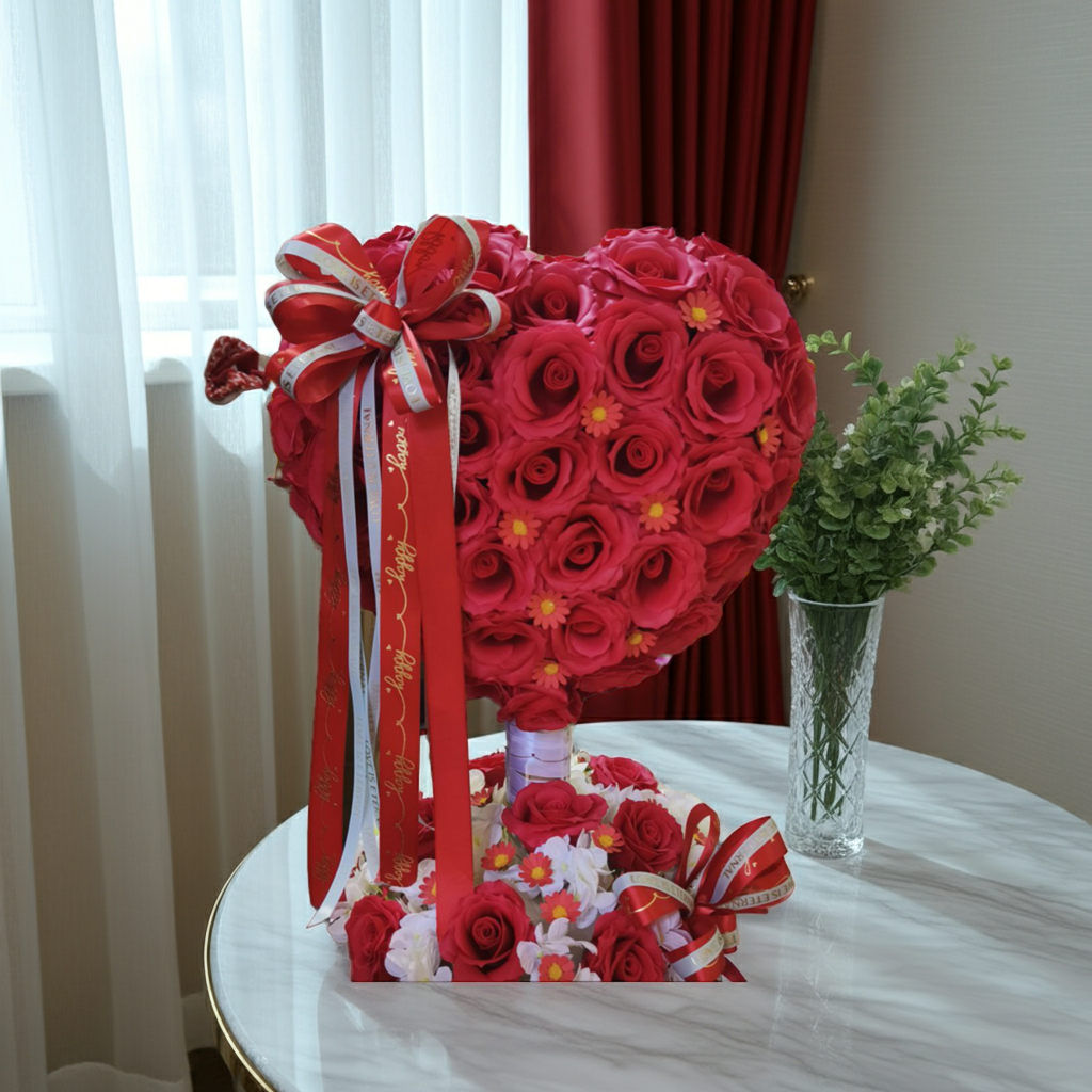 A luxury heart-shaped bouquet of vibrant red roses, decorated with elegant red ribbons and floral accents. A perfect romantic gift for Valentine’s Day, anniversaries, or special occasions.